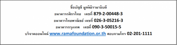 ผู้มีจิตศรัทธาร่วมบริจาคได้ที่ชื่อบัญชี มูลนิธิรามาธิบดี โครงการเพื่อผู้ป่วยยากไร้