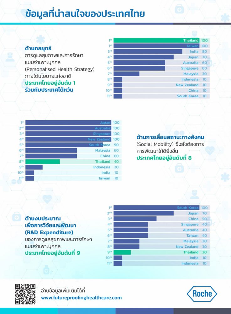 ข้อมูลจากดัชนีประเมินความพร้อมของการดูแลสุขภาพและการรักษาแบบจำเพาะบุคคล พบว่า ขณะนี้ประเทศไทยอยู่ในกลุ่ม “Focus Area Country” ร่วมกับมาเลเซีย จีน และอินเดีย ซึ่งเป็นกลุ่มประเทศที่อยู่ในขั้นเริ่มต้นของการนำแนวทางการดูแลสุขภาพและการรักษาแบบจำเพาะบุคคลมาปรับใช้ ทั้งนี้ดัชนีดังกล่าวใช้เกณฑ์พิจารณาความพร้อมออกเป็น 4 ด้านหลัก ได้แก่ (1) ด้านนโยบาย (2) ด้านข้อมูล (3) ด้านบริการ และ (4) ด้านเทคโนโลยี โดยภาพรวมประเทศไทยมีความพร้อมอยู่ในลำดับที่ 7 จากเมื่อเทียบประเทศต่างๆ ในภูมิภาคเอเชียแปซิฟิก 11 ประเทศ หากจำแนกตามความพร้อมในแต่ละด้านนั้น ประเทศไทยจะอยู่ลำดับที่ 7 ด้านนโยบาย, ที่ 5 ด้านข้อมูล, ที่ 6 ด้านบริการ และอยู่อันดับรั้งท้ายด้านเทคโนโลยี