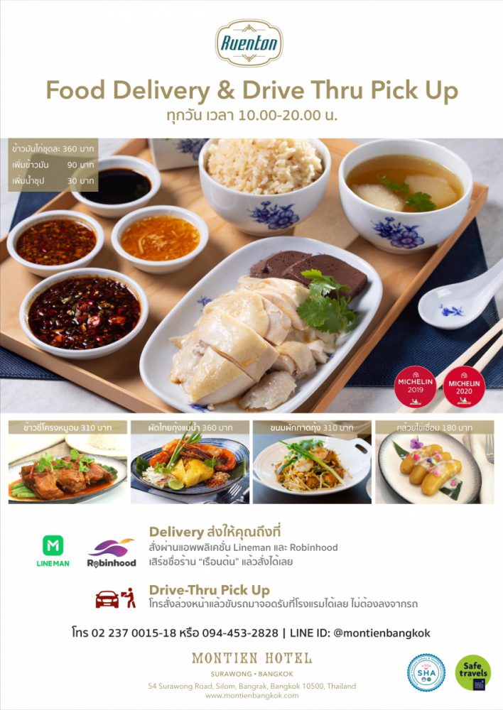 นอกจากนี้ทางโรงแรมฯ ยังมีบริการส่งเดลิเวอรีผ่านแอพพลิเคชั่น Robinhood และ LINE MAN โดยค้นหา ชื่อห้องอาหาร ‘เรือนต้น’ สำหรับเมนูข้าวมันไก่มณเฑียร หรือ ‘พระรามสี่’ สำหรับครัวซองต์และขนมอบพรีเมียมโดยเชฟแอร์เว่ แฟร์ราด