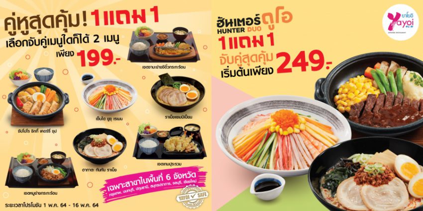 ยาโยอิ ส่ง 2 โปรโมชันสุดคุ้ม เอาใจ 6 จังหวัด 1 แถม 1 คู่หู สุดคุ้ม 199 บาท และฮันเตอร์ ดูโอ้ เซตอาหารญี่ปุ่นราคาพิเศษ