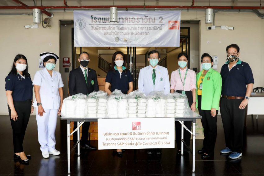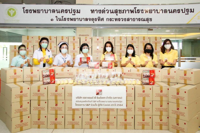 บริษัท เอส แอนด์ พี ซินดิเคท จำกัด (มหาชน) นำโดย คุณมณีสุดา ศิลาอ่อน ผู้อำนวยการสำนักพัฒนาความยั่งยืนและสื่อสารองค์กร ร่วมส่งกำลังใจให้กับทีมแพทย์ พยาบาล เจ้าหน้าที่ และผู้ป่วยโรคโควิด-19 โดยมอบผลิตภัณฑ์เอส แอนด์ พี ทั้งอาหารกล่อง อาหารแช่แข็ง เบเกอรี่ เจลิโอเจลลี่ และน้ำดื่ม ให้แก่โรงพยาบาลต่างๆ และโรงพยาบาลสนามในภูมิภาคต่างๆ ทั่วประเทศ รวม 35 แห่ง ระหว่างวันที่ 21-30 เมษายน 2564 ภายใต้โครงการ “S&P ร่วมใจสู้ภัย โควิด-19 ปี 2564”