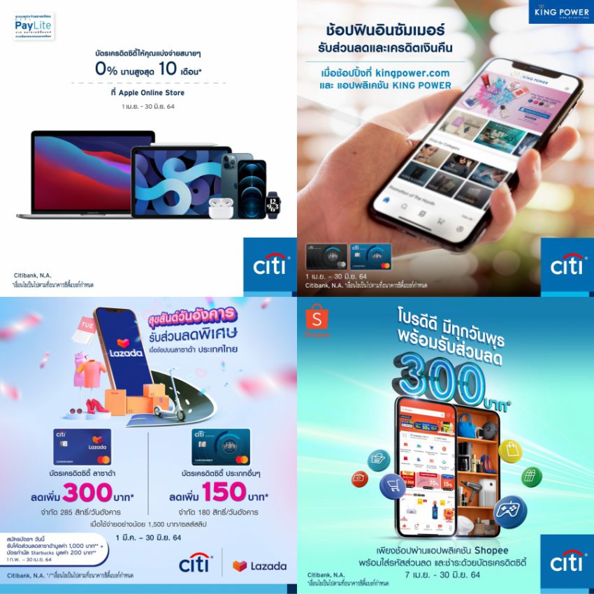 โดยเฉพาะในช่วง Work From Home บัตรเครดิตซิตี้ ได้จัดแคมเปญช้อปออนไลน์ เพื่อตอบสนองความต้องการเหล่านักช้อป นักชิม สามารถเลือกสรรทุกสิ่งที่ต้องการได้อย่างเพลิดเพลินใจ พร้อมจัดเต็มสิทธิประโยชน์มากมาย ทั้งส่วนลด เครดิตเงินคืน หรือเลือกผ่อนชำระสบาย ๆ ครบครันทุกบริการทั้งสั่งอาหารด้วยบริการจากแอปพลิเคชั่นยอดนิยมอย่าง ฟู้ดแพนด้า ไลน์แมน  หรือออเดอร์วัตถุดิบจากซูเปอร์มาร์เก็ตออนไลน์ อย่างบิ๊กซี, เทสโก้ โลตัส, ท็อปส์ และวิลล่า มาร์เก็ต มาทำอาหารรับประทานเอง ก็อิ่มอร่อยทุกมื้อ หรือช้อปสินค้าแบรนด์ดังจากทั่วทุกมุมโลกกับคิงส์ พาวเวอร์ รวมถึงจับมือซูเปอร์แอป ชั้นนำ ทั้งช้อปปี้ ลาซาด้า จัดดีลสุดปังประจำสัปดาห์ และเอาใจคนรักบ้าน ด้วยโปรสุดพิเศษจากศูนย์รวมสินค้าเกี่ยวกับบ้านชื่อดัง ไม่ว่าจะเป็น บุญถาวร, โฮมโปร, อินเด็กซ์ ลิฟวิ่งมอลล์ และบริการช่างและแม่บ้านมืออาชีพจากเซอร์วิส ฮีโร่ ที่จะทำให้การอยู่บ้านเพลินใจมากกว่าที่เคย