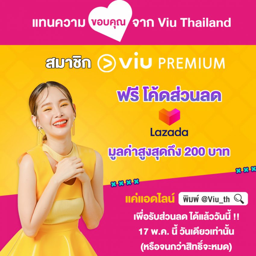*สมาชิกที่เป็น Viu Premium ตั้งแต่แอปพลิเคชั่นเปิดตัววันแรก และเป็นสมาชิกจนถึงปัจุบัน จะได้รับคูปองส่วนลดจาก Lazada มูลค่า 200 บาท จำนวน 500 สิทธิ์