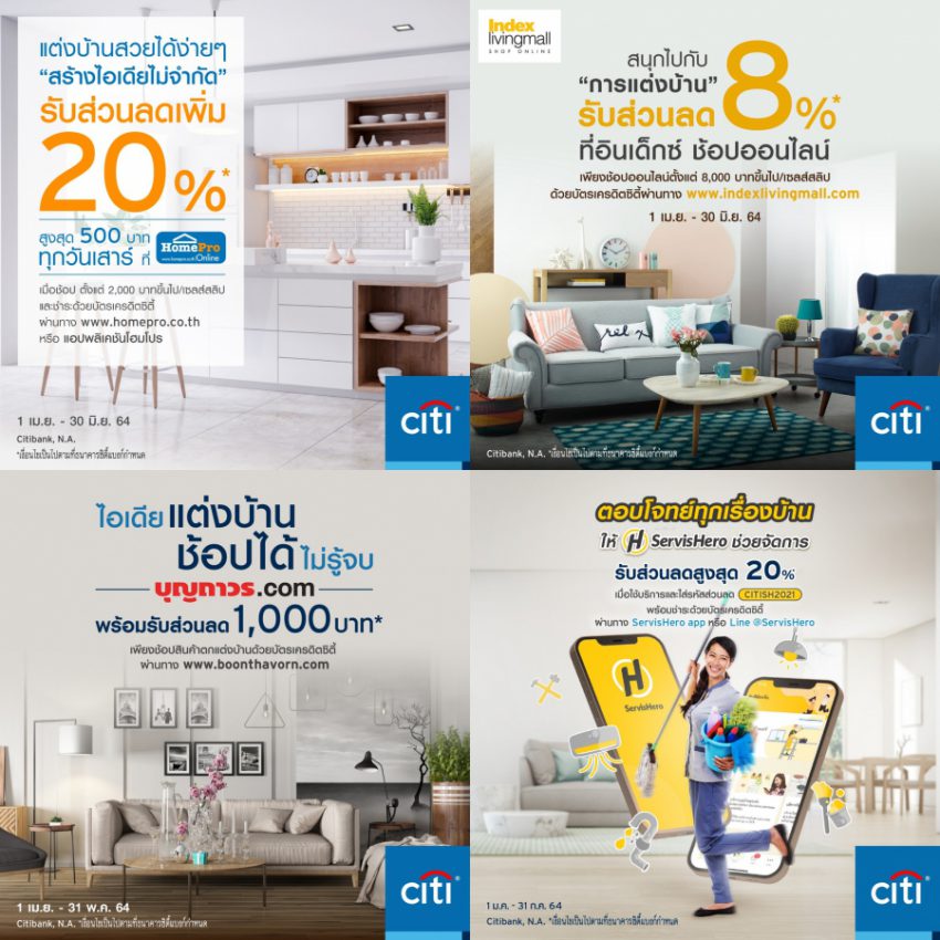 Work from Home ยิ่งนาน บ้านยิ่งต้องสวย ด้วยสิทธิพิเศษมากมายที่ ซิตี้แบงก์ ผู้นำสิทธิประโยชน์ด้านไลฟ์สไตล์ ส่งต่อดีลดี ๆ ให้คนรักบ้านได้เนรมิตมุมใหม่อย่างใจฝัน กับโปรโมชั่นช้อปออนไลน์สุดพิเศษจากศูนย์รวมสินค้าเกี่ยวกับบ้านชื่อดัง และบริการช่างและแม่บ้านมืออาชีพ ที่จะทำให้การอยู่บ้านเพลินใจมากกว่าที่เคย