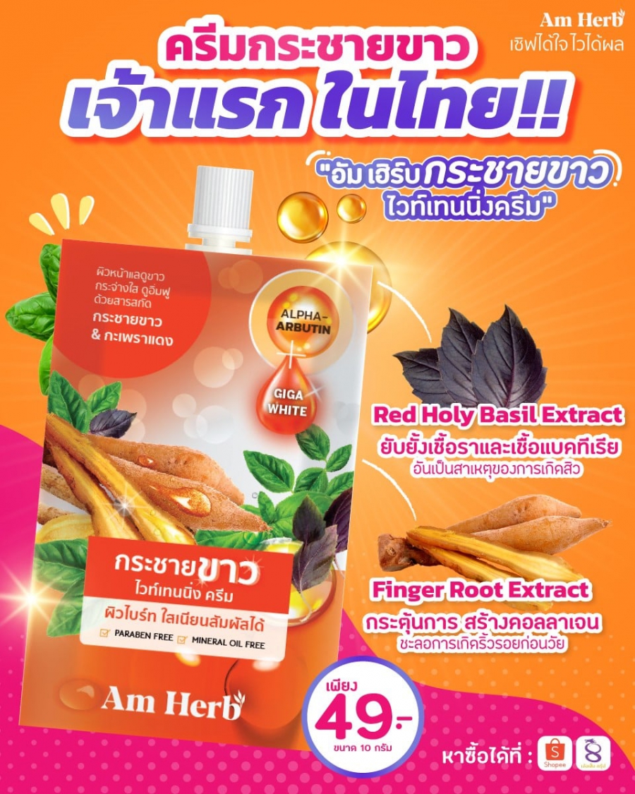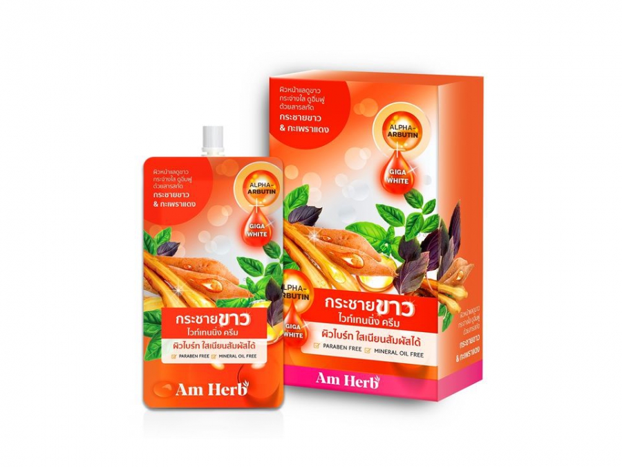 - ตัวสุดท้าย Krachai Kao Whitening Cream (อัมเฮิร์บ กระชายขาว ไวท์เทนนิ่ง ครีม) ด้วยสารสกัด จากกระชายขาว และสารสกัดจากกะเพราแดง ช่วยให้ผิวหน้าแลดูขาวกระจ่างใส แลดูอิ่มฟู กระชับรูขุมขน สามารถใช้ได้ทุกสภาพผิว แม้ผิวมัน เนื้อครีมเจลทาง่าย ซึมเข้าสู่ผิวเร็ว แลดูกระจ่างใสเรียบเนียน จนสังเกตเห็นได้