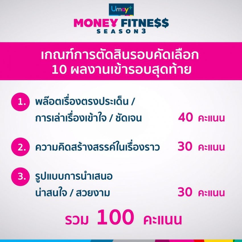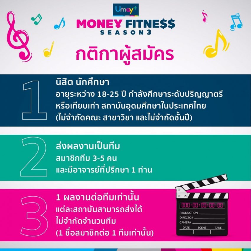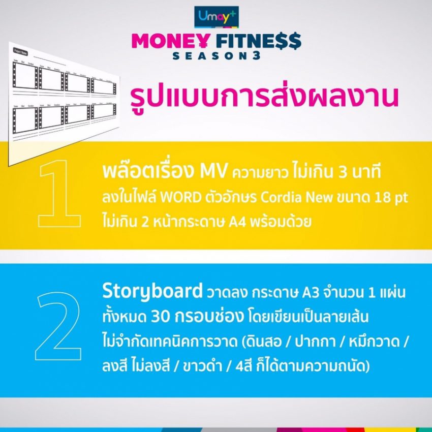 สำหรับ กิจกรรม Umay+ “MONEY FITNESS” Season 3 การประกวดสตอรี่บอร์ดเพื่อผลิตมิวสิค วีดีโอภายใต้ หัวข้อ “ชีวิตติดหนี้…Gen Z จัดการได้” จะเปิดรับสมัครในวันนี้ถึง 31 สิงหาคม 2564 น้องๆที่สนใจสามารถส่งเอกสารการสมัครและติดตามรายละเอียดต่างๆได้ที่ www.umayplusmoneyfitness.com หรือ Facebook Fan page : I love EASYBUY หรือ โทร (094)647-9192