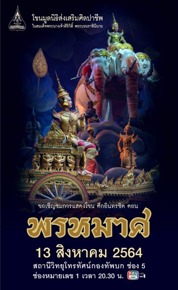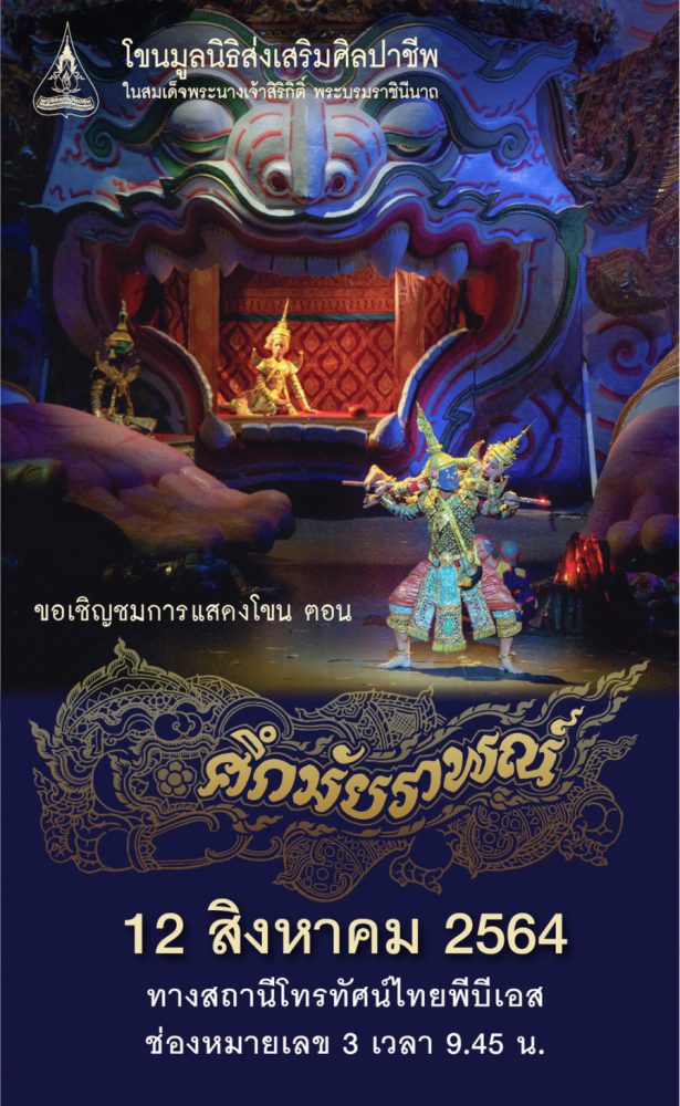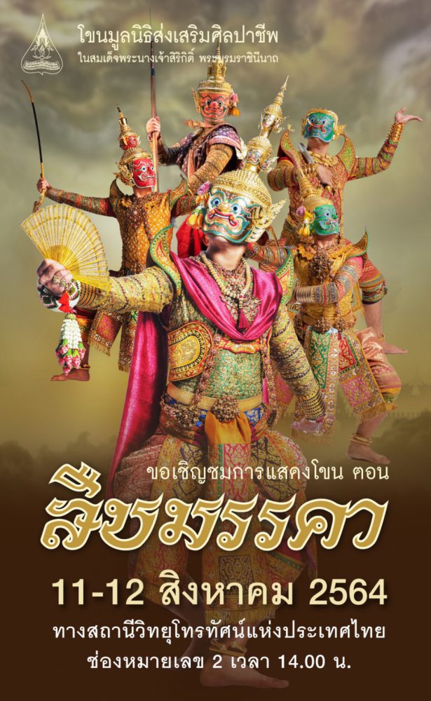 เนื่องในโอกาสวันเฉลิมพระชนมพรรษา ๘๙ พรรษา สมเด็จพระนางเจ้าสิริกิติ์ พระบรมราชินีนาถ พระบรมราชชนนีพันปีหลวง ๑๒ สิงหาคม ๒๕๖๔ มูลนิธิส่งเสริมศิลปาชีพ ในสมเด็จพระนางเจ้าสิริกิติ์ พระบรมราชินีนาถ ร่วมสืบสานพระราชปณิธานของสมเด็จพระบรมราชชนนีพันปีหลวงในการอนุรักษ์ และสืบสานศิลปะการแสดงโขนให้ดำรงอยู่คู่แผ่นดินไทยสืบไป ขอเชิญชวนประชาชนชาวไทยชมบันทึกการแสดงโขนมูลนิธิส่งเสริมศิลปาชีพฯ ความงดงามที่รังสรรค์ขึ้นด้วยศาสตร์และศิลป์หลายแขนง ที่ได้กลับมาสร้างความประทับใจให้ผู้ชมผ่านหน้าจอโทรทัศน์อีกครั้ง โดยนำเสนอ ๓ ตอนยอดนิยม ได้แก่ สืบมรรคา, ศึกมัยราพณ์ และศึกอินทรชิต ตอนพรหมาศ พร้อมออกอากาศผ่านทางสถานีโทรทัศน์ ๓ ช่อง ระหว่างวันที่ ๑๑ – ๑๓ สิงหาคมนี้ ตามรายละเอียดดังนี้