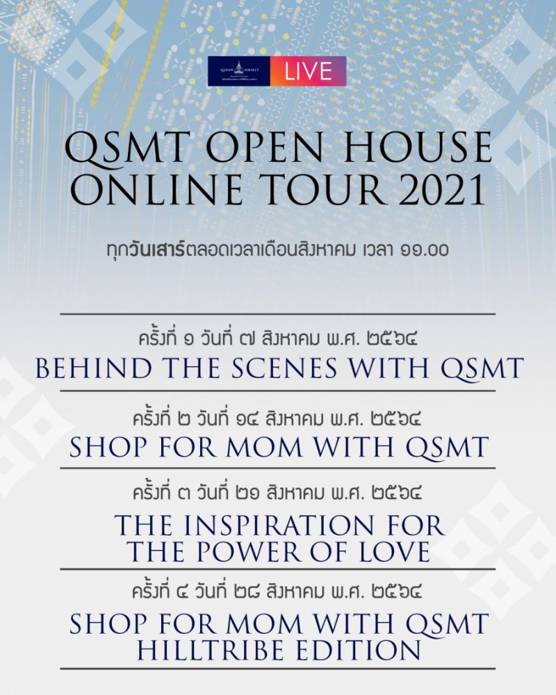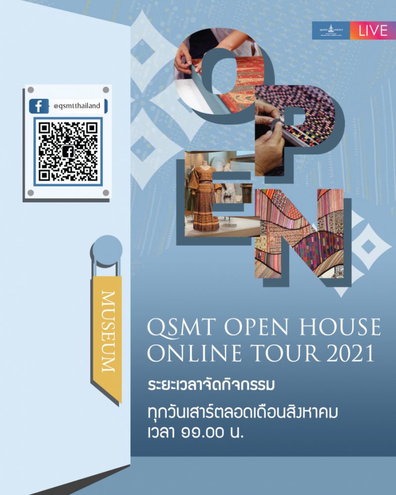ติดตามกิจกรรมเปิดบ้านออนไลน์ “QSMT OPEN HOUSE: ONLINE TOUR 2021” ที่จะพาทุกท่านไปทำความรู้จักพิพิธภัณฑ์ผ้าฯ ในทุกแง่มุมที่หลายคนอาจไม่เคยรู้มาก่อน ในวันเสาร์ที่ ๗, ๑๔, ๒๑ และ ๒๘ สิงหาคมนี้ ตั้งแต่เวลา ๑๑.๐๐ เป็นต้นไป ได้ทางเฟซบุ๊ก www.facebook.com/qsmtthailand และ เฟซบุ๊ก www.facebook.com/qsmtshop