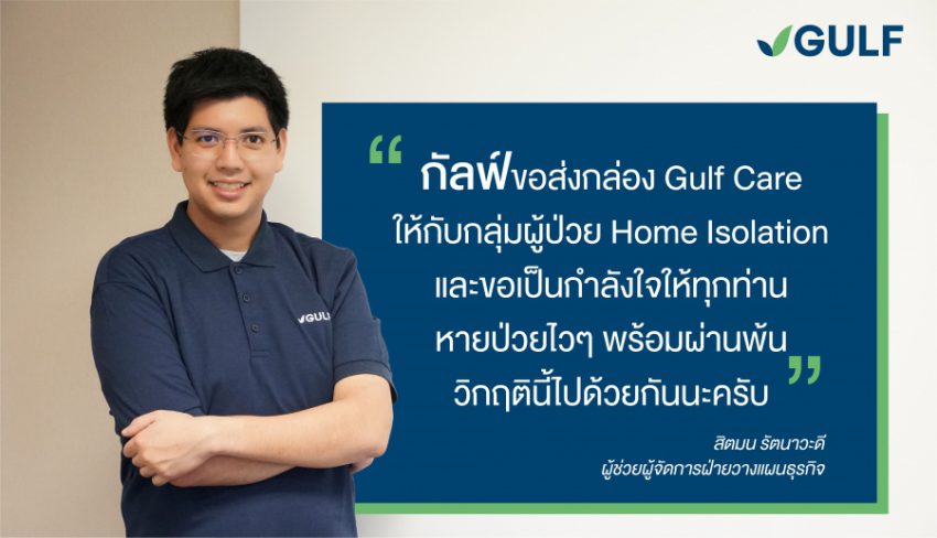 นายสิตมน รัตนาวะดี ผู้ช่วยผู้จัดการฝ่ายวางแผนธุรกิจ ตัวแทนบริษัท กัลฟ์ เอ็นเนอร์จี ดีเวลลอปเมนท์ จำกัด (มหาชน) กล่าวว่า จากยอดผู้ติดเชื้อโควิด-19 ที่เพิ่มสูงขึ้นต่อเนื่อง มีผู้ป่วยจำนวนมากที่อยู่ระหว่างการแยกรักษาตัวเองที่บ้าน (Home Isolation) หรือแยกรักษาตัวในชุมชน (Community Isolation) บางกลุ่มอาจอยู่ระหว่างรอเตียง ซึ่งหลายคนอาจยังไม่มีความพร้อมเรื่องยาและอุปกรณ์ในการตรวจเช็คอาการระหว่างรักษาตัวที่บ้าน ทาง GULF จึงทำกล่อง GULF CARE (กัลฟ์แคร์) ขึ้นมา โดยภายในกล่องประกอบด้วยเครื่องวัดออกซิเจนปลายนิ้ว ปรอทวัดไข้แบบดิจิทัล ยาพาราเซตามอล ยาแคปซูลฟ้าทะลายโจร หน้ากากอนามัย และเจลแอลกอฮอล์ ซึ่งเพียงพอสำหรับการรักษาตัวอย่างน้อย 14 วัน รวมทั้งมีคำแนะนำสำหรับการรักษาตนเองที่บ้านด้วย โดยทางเราหวังว่ากล่อง GULF CARE (กัลฟ์แคร์) จะเป็นอีกแรงที่ช่วยสนับสนุน ทำให้ผู้ป่วยมีอาการดีขึ้นหรือหายป่วยได้ในเร็ววัน