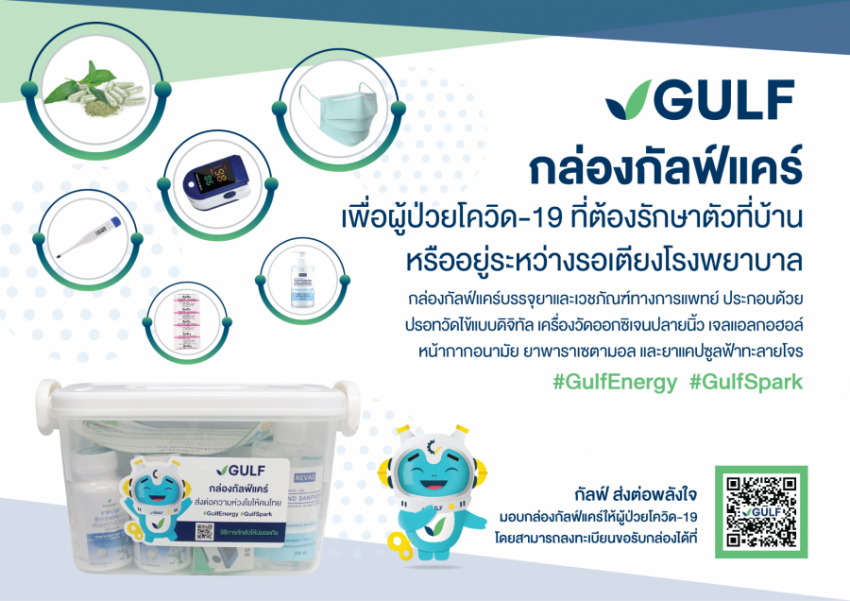 บริษัท กัลฟ์ เอ็นเนอร์จี ดีเวลลอปเมนท์ จำกัด (มหาชน) หรือ GULF จัดทำกล่อง “GULF CARE” (กัลฟ์แคร์) บรรจุยาและเวชภัณฑ์ทางการแพทย์สำหรับผู้ป่วยโควิด-19 ซึ่งไม่แสดงอาการรุนแรง สามารถแยกรักษาตัวที่บ้าน (Home Isolation) แยกรักษาตัวในชุมชน (Community Isolation) หรืออยู่ระหว่างรอเตียง เตรียมส่งมอบให้หน่วยงานและกลุ่มจิตอาสาที่ให้ความช่วยเหลือผู้ป่วยโควิด-19 เช่น เส้นด้าย และมูลนิธิกระจกเงา ตั้งเป้า 10,000 ชุด มูลค่ากว่า 10 ล้านบาท นอกจากนี้ผู้ป่วยสามารถแจ้งความประสงค์ขอรับกล่อง GULF CARE โดยกรอกแบบฟอร์มที่ https://bit.ly/gulfcareform หรือสแกน QR Code ด้านล่าง ทั้งนี้โครงการนี้เป็นส่วนหนึ่งของ “Gulf Sparks Smiles จุดพลังให้คนไทยยิ้มได้” ที่ริเริ่มขึ้นเพื่อมุ่งช่วยเหลือคนหลากหลายกลุ่มที่ได้รับผลกระทบจากการแพร่ระบาดของโควิด-19 ท่านสามารถดูรายละเอียดเพิ่มเติมได้ที่เฟสบุ๊คแฟนเพจ https://www.facebook.com/GulfSPARK.TH/