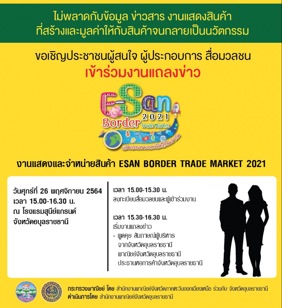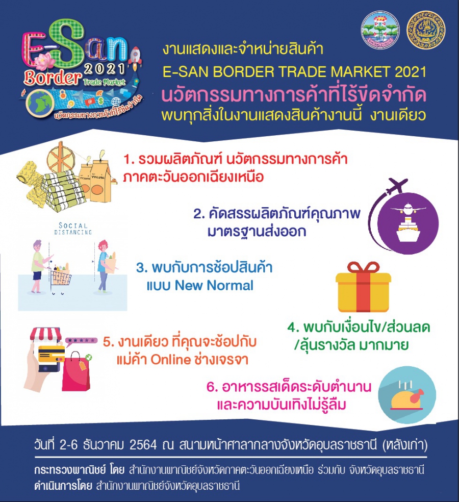 กระทรวงพาณิชย์ โดยสำนักงานพาณิชย์จังหวัดภาคตะวันออกเฉียงเหนือ ร่วมกับจังหวัดอุบลราชธานี ดำเนินการโดย สำนักงานพาณิชย์จังหวัดอุบลราชธานี กำหนดจัดงาน “E-san Border Trade Market 2021” ระหว่างวันที่ 2-6 ธันวาคม 2564 ณ ลานขวัญเมืองหรือสนามหน้าศาลากลางจังหวัดอุบลราชธานี (หลังเก่า) อำเภอเมืองอุบลราชธานี จังหวัดอุบลราชธานี