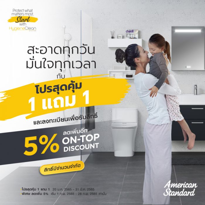 New Year… New Bathroom อเมริกันสแตนดาร์ด แบรนด์สุขภัณฑ์ชั้นนำระดับโลก ภายใต้ ลิกซิล กรุ๊ป ชวนคนไทยเปลี่ยนสุขภัณฑ์ชิ้นใหม่ ยกระดับความสะอาดให้แก่ห้องน้ำบ้านคุณ.เสริมเกราะป้องกันชีวิตวิถีใหม่กับแคมเปญ HygieneClean ที่มากับสโลแกน “Protect What Matters Most. Start with HygieneClean” ส่งโปรสุดคุ้ม 1 แถม 1 เมื่อซื้อสุขภัณฑ์รุ่นยอดนิยมที่ร่วมรายการ รับฟรี! อ่างล้างหน้าดีไซน์สวยเข้าชุด ให้คุณมีห้องน้ำสวย สะอาด พร้อมปกป้องคุณทุกวันตลอด 24 ชั่วโมงด้วย “HygieneClean System” นวัตกรรม เอกสิทธิ์หนึ่งเดียวจากอเมริกันสแตนดาร์ด
