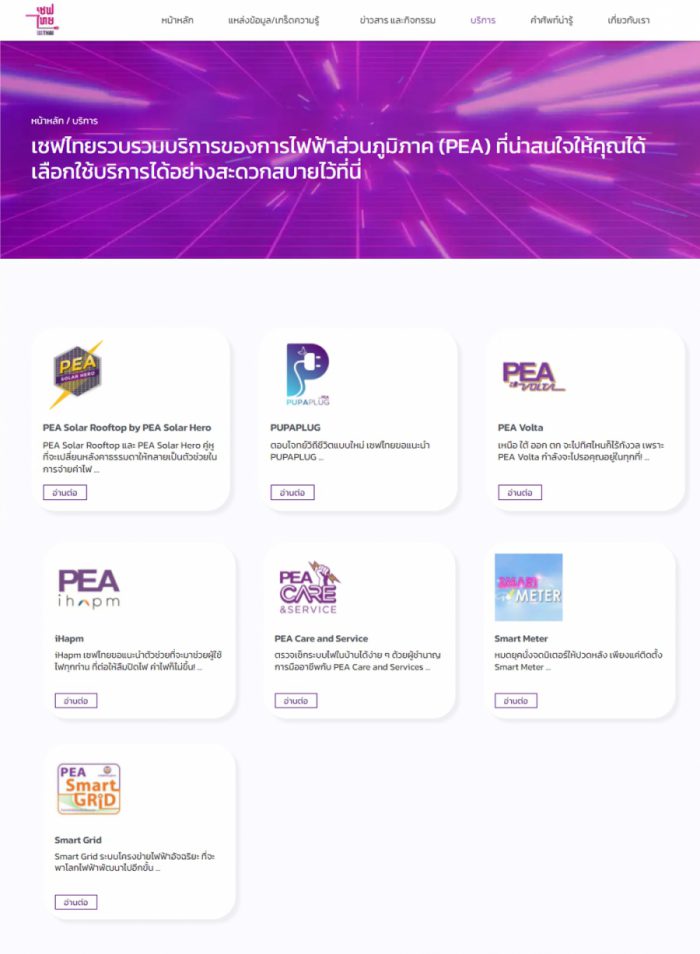 นอกจากจะแบ่งปันความรู้ และเคล็ดลับดี ๆ สำหรับการใช้ไฟฟ้าให้ปลอดภัยและประหยัดแล้ว เซฟไทย.com ยังมีพื้นที่ไว้สำหรับนำเสนอบริการเสริมดี ๆ จากการไฟฟ้าส่วนภูมิภาค (PEA) แบบ One Stop Service อีกด้วย โดยมีบริการมากมายที่มาช่วยอำนวยความสะดวกในชีวิตประจำวันให้ผู้ใช้ไฟทุกคน ไม่ว่าจะเป็น การตรวจเช็กระบบไฟฟ้าภายในบ้านพักอาศัยประจำปีไปกับ PEA Care and Service ที่ช่วยหาผู้เชี่ยวชาญมาตรวจสอบระบบไฟฟ้า การมอบความสบายใจตลอดการขับขี่ยานยนต์ไฟฟ้าได้อย่างไร้กังวล กับ PEA Volta ที่คอยช่วยระบุหาตำแหน่งที่ตั้งสถานีอัดประจุไฟฟ้า และบริการอื่น ๆ อีกมากมายจากการไฟฟ้าส่วนภูมิภาค (PEA)