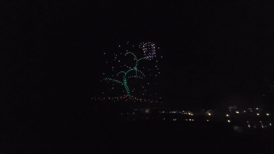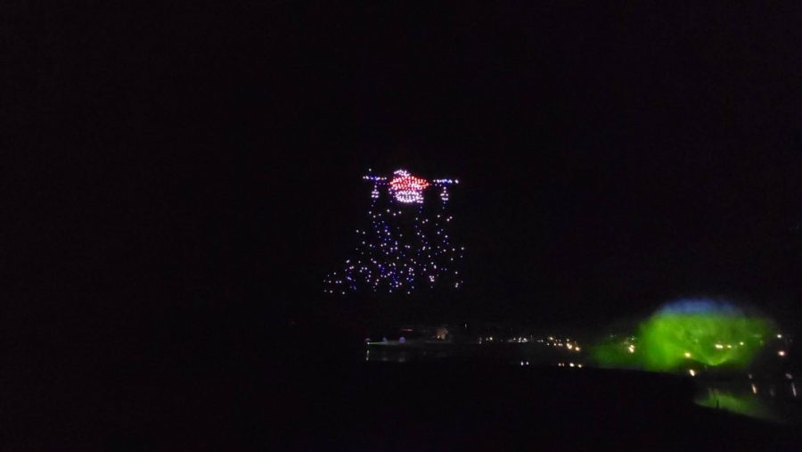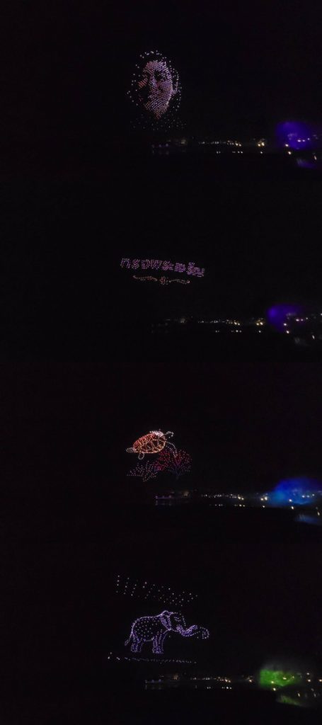 จากนั้น ทอดพระเนตรการแสดงโดรนแปรอักษรประกอบ แสง สี เสียง ซึ่ง ปตท.สผ. และเออาร์วี หรือสมาคมกีฬาเครื่องบินจำลองและวิทยุบังคับ ควบคุมการบินโดยหนูน้อยจ้าวเวหา จัดแสดงขึ้นด้วยความสำนึกในพระมหากรุณาธิคุณ โดยใช้โดรนจำนวนกว่า 700 ลำ ทำการแสดงรวม 9 ภาพ ในรูปแบบ 3 มิติ ผสานม่านน้ำมัลติมีเดีย โดยนำเสนอความมุ่งมั่นของ ปตท.สผ. ในการอนุรักษ์ทรัพยากรทางทะเล รวมถึงเทคโนโลยีเพื่อภาคการเกษตรของไทย และพระราชกรณียกิจสมเด็จพระกนิษฐาธิราชเจ้า กรมสมเด็จพระเทพรัตนราชสุดาฯ สยามบรมราชกุมารี