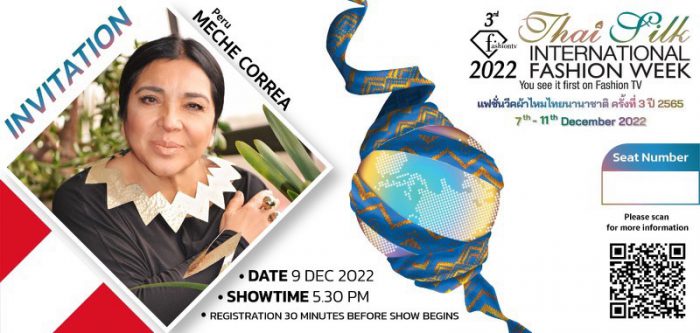 Meche Correa ดีไซน์เนอร์ชื่อดังจากประเทศเปรู ผลงานที่ผ่านมามีเสื้อผ้ามากมายหลายแบบ หลายคอลเลคชั่น ที่ได้รับการยอมรับอย่างยิ่งใหญ่ในระดับประเทศและระดับนานาชาติ โดยเป็นสัญลักษณ์แห่งความหรูหราที่ยั่งยืนแสดงถึงปรัชญาและวิถีชีวิตที่มีจริยธรรมและมีความรับผิดชอบ การอนุรักษ์และดูแลโลกของเรา Meche Correa เป็นหนึ่งในดีไซน์เนอร์ชั้นนำจากนานาประเทศกว่า 60 ประเทศ ที่ได้รับเกียรติให้ออกแบบและนำผลงานเสื้อผ้าชุดผ้าไหมร่วมสมัยที่ออกแบบ จำนวน 2 ชุด ที่มีความประณีตและสวยงดงาม มาร่วมงานแฟชั่นวีคผ้าไหมไทยนานาชาติ ครั้งที่ 3 ปี 2565 เพื่อเฉลิมพระเกียรติสมเด็จพระนางเจ้าสิริกิติ์ พระบรมราชินีนาถ พระบรมราชชนนีพันปีหลวง เนื่องในโอกาสมหามงคลเฉลิมพระชนมพรรษา 90 พรรษา12 สิงหาคม 2565 ในวันศุกร์ที่ 9 ธันวาคม 2565 รอบโชว์เวลา 17.30 น. ณ รอยัล พารากอนฮอลล์ ศูนย์การค้าสยามพารากอน
