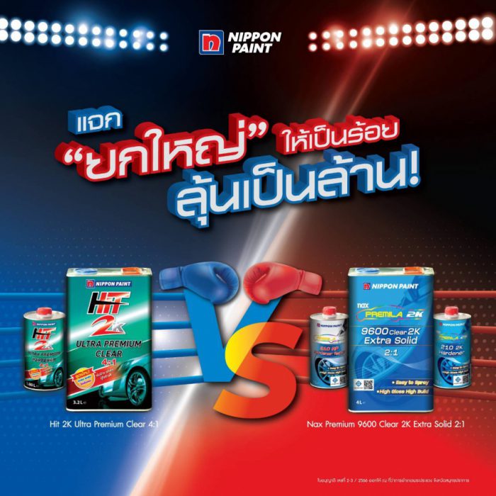 นายนพดล ศรีสินรุ่งเรือง ผู้จัดการทั่วไป ร่วมกับ นายเสกสรรค์ ตันมธุสรชัย ผู้ช่วยผู้จัดการทั่วไป และนาย ศุภฤกษ์ แก้วกาญจน์ ผู้บริหารฝ่ายขาย บริษัท นิปปอนเพนต์ (ประเทศไทย) จำกัด หน่วยธุรกิจสีพ่นซ่อมรถยนต์ ผู้นำด้านสีพ่นรถยนต์ จัดแคมเปญแจก “ยกใหญ่” ให้เป็นร้อย ลุ้นเป็นล้าน ง่ายๆเมื่อซื้อผลิตภัณฑ์ ฮิต 2K อัลตร้า พรีเมี่ยม เคลียร์4:1 หรือ แนกซ์ พรีมิล่า 9600 เคลียร์ 2K เอ็กซ์ตร้า โซลิด 2:1 จำนวน 1 ชุดได้รับ 1สิทธิ์ เพื่อลุ้นรับรางวัล ต่างๆมากมายดังนี้