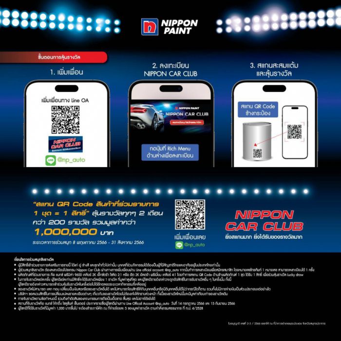 รางวัลที่1 สร้อยคอทองคำหนัก 1บาท ,รางวัลที่2 สร้อยคอทองคำหนัก 50 สตางค์ ,รางวัลที่3 สร้อยคอทองคำหนัก 25 สตางค์ ,รางวัลที่4 ผลิตภัณฑ์ดูแลรถยนต์ NAXPRO ,รางวัลที่5 บัตรกำนัลโลตัสมูลค่า3,000 บาท และ รางวัลที่6 คะแนน Point in Car Club 2,000 คะแนน กติกา เพียงสแกน QR Code เพิ่มเพื่อน @np_auto จากนั้นลงทะเบียน NIPPON CAR CLUB สุดท้ายสแกนสะสมแต้มลุ้นรับรางวัลโดยการสแกนQR Code ข้างกระป๋อง จับรางวัล 2 ครั้ง ครั้งที่ 1วันที่ 14 กรกฎาคม 2566 สำหรับสิทธิ์สแกน วันที่ 8พ.ค.-30มิ.ย. 2566 และจับรางวัลครั้งที่ 2 วันที่ 15 กันยายน 2566 สำหรับสิทธิ์สแกน วันที่ 1 ก.ค.-31ส.ค. 2566