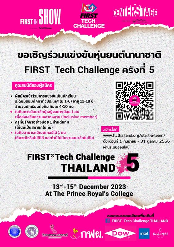 กลุ่มบริษัท ดาว ประเทศไทย (Dow) และพันธมิตร เปิดรับสมัครผู้ท้าชิงที่กำลังศึกษาอยู่ในระดับชั้น ม.1-ม.6 หรือเทียบเท่า ร่วมสร้างทีมจำนวน 4-10 คน (ควรมีสมาชิกผู้หญิงอย่างน้อย 1 คน (inclusive member) เพื่อส่งเสริมความหลากหลาย) เพื่อเข้าร่วมการแข่งขันหุ่นยนต์ FIRST® Tech Challenge Thailand ครั้งที่ 5 มุ่งสร้างเครือข่ายการเรียนรู้ STEM Education พัฒนาผู้เรียนด้านทักษะกระบวนการคิด การแก้ปัญหา การออกแบบ และการสร้างสรรค์นวัตกรรมเพื่อพิชิตภารกิจในหัวข้อ “CENTERSTAGE Presented by RTX” ระหว่างวันที่ 13-15 ธันวาคม 2566 ณ โรงเรียนปรินส์รอยแยลส์วิทยาลัย จ.เชียงใหม่ ชิงถ้วยพระราชทานสมเด็จพระกนิษฐาธิราชเจ้า กรมสมเด็จพระเทพรัตนราชสุดาฯ สยามบรมราชกุมารี พร้อมทุนการศึกษา ได้รับสิทธิ์ในการเป็นตัวแทนประเทศไทยเพื่อเข้าร่วมการแข่งขันระดับนานาชาติที่สหรัฐอเมริกา ผู้ที่สนใจเข้าร่วมการแข่งขันสามารถดูรายละเอียดการสมัครได้ที่ www.ftcthailand.org/start-a-team/ โดยปิดรับสมัครภายในวันที่ 31 ตุลาคม 2566 ท่านสามารถศึกษาข้อมูลเพิ่มเติมเกี่ยวกับการแข่งขันได้ที่ www.ftcthailand.org/ หรือสอบถามรายละเอียดได้ที่ Inbox ของ www.facebook.com/FIRSTTechChallengeTHAILAND