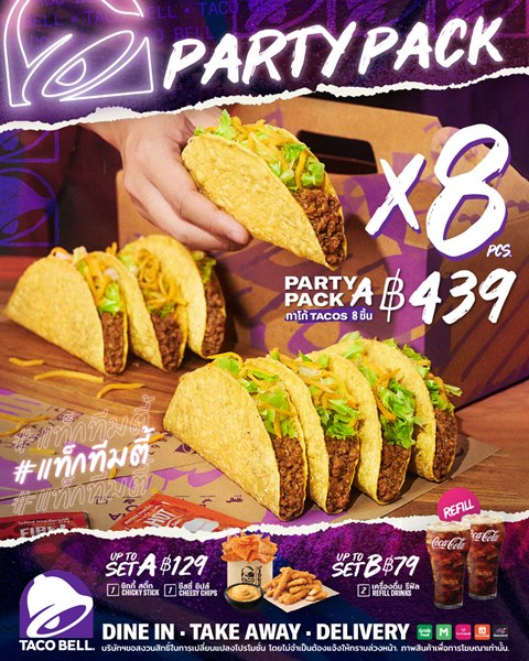 บริษัท สยามทาโก้ จำกัด ผู้บริหารแฟรนไชส์ ทาโก้ เบลล์ (Taco Bell) ในประเทศไทย เชิญชวนชาวไทยมาร่วมลิ้มรสความอร่อยจุใจยกแก๊งส่งท้ายปี กับโปรโมชั่นล่าสุด “Party Pack #แท็กทีมตี้” กับหลากหลายเมนูความอร่อยสไตล์เม็กซิกันแบบจัดเต็มที่มีให้เลือกด้วยกันถึง 3 ชุดใหญ่ พิเศษด้วยรสชาติความอร่อยครบรสสไตล์เม็กซิกัน ด้วยทาโก้ที่เลือกฟินได้ทั้งแป้งกรอบและแป้งนุ่ม ผสานความสดชื่นจากผักกาดแก้วสดฉ่ำ โรยหน้าด้วยเชดดาร์ชีส มอบความอร่อยครบรสในคำเดียวได้แบบจุใจกับทาโก้ 8 ชิ้น ในราคาเริ่มต้นเพียง 439 บาท โดยไปแท็กทีมตี้กันได้ที่ทาโก้เบลล์ทุกสาขา (ยกเว้นสาขาสนามบินสุวรรณภูมิ) ตั้งแต่วันนี้จนถึงวันที่ 29 กุมภาพันธ์ พ.ศ. 2567 หรือกดสั่งแบบเดลิเวอรี่ไปตี้ที่บ้านได้ตั้งแต่วันที่ 23 ธันวาคม พ.ศ. 2566 เป็นต้นไป