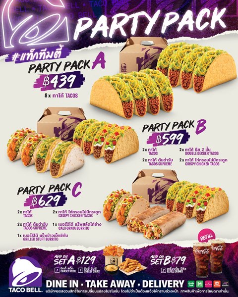 - ชุด Party Pack C อิ่มอร่อยยกแก๊งชุดใหญ่ กับเบอร์ริโต้ 2 ชิ้น 2 รสชาติ อย่าง เบอร์ริโต้ แร็พสลัดไก่ย่าง และเบอร์ริโต้ แร็พข้าวเม็กซิกัน พร้อมทาโก้อีก 6 ชิ้น 3 รสชาติ ได้แก่ ทาโก้ (Tacos) ทาโก้ต้นตำรับ (Tacos Supreme) และทาโก้ไก่กรอบไม่มีกระดูก (Crispy Chicken Tacos) ในราคาเริ่มต้นเพียง 629 บาท