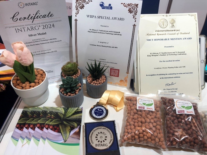 นักวิจัย สถาบันเทคโนโลยีพระจอมเกล้าเจ้าคุณทหารลาดกระบัง (สจล.) คว้ารางวัล Silver Medal จาก INTARG 2024 และ Special Award จาก WIIPA (World Invention Intellectual Property associations) จากผลงาน CeraGrow: Porous Planting Pellets with NPK (เซราโกรว: เม็ดดินรูพรุนเสริมธาตุอาหารพืช) ในงาน “The 17th International Invention and Innovation Show: INTARG 2024” เมื่อวันที่ 21-23 พฤษภาคม 2567 ณ MCK Katowice, International Congress Centre เมืองคาโตไวซ์ สาธารณรัฐโปแลนด์ โดยเป็นผลงานของ ผศ. ดร.เมตยา กิติวรรณ ภาควิชาฟิสิกส์ คณะวิทยาศาสตร์ และผศ. ดร.พชรพล ตัณฑวิรุฬห์ ภาควิชาวิศวกรรมอุตสาหการ คณะวิศวกรรมศาสตร์ สจล.