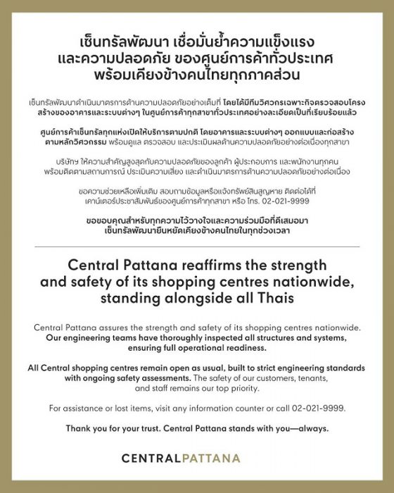 ศูนย์การค้าเซ็นทรัลทุกแห่งเปิดให้บริการตามปกติ โดยอาคารและระบบต่าง ๆ ออกแบบและ ก่อสร้างตามหลักวิศวกรรม พร้อมดูแล ตรวจสอบ และประเมินผลด้านความปลอดภัยอย่างต่อเนื่องทุกสาขา เพื่อให้มั่นใจว่าทุกแห่งมีความปลอดภัยและพร้อมให้บริการ