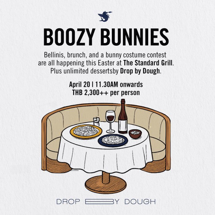 Boozy Bunnies Brunch ราคาท่านละ 2,300++ บาท รวมอาหารและเครื่องดื่มซอฟท์ดริ้งค์ไม่อั้น หรือเลือกเอนจอยแพ็กเกจเครื่องดื่มแอลกอฮอล์เพิ่มที่ 800++ บาทต่อท่าน งานบรันช์นี้จะจัดที่ The Standard Grill ในวันอาทิตย์ที่ 20 เมษายน ตั้งแต่เวลา 11.30 – 15.00 น. สามารถซื้อตั๋วได้แล้วที่ https://megatix.in.th/events/boozy-bunnies-brunch-at-the-standard-bangkok หรือสอบถามข้อมูลเพิ่มเติมโทร. 02 085 8888 อีเมล stbkk@standardhotels.com หรือแอดไลน์ OA ที่ @TheStandardBangkok