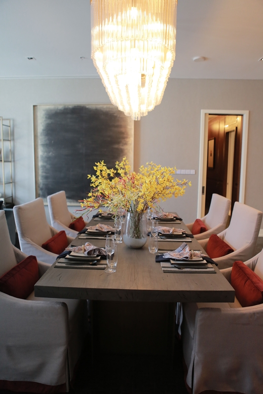 ต่อมาที่มุมโต๊ะรับประทานอาหาร สำหรับโต๊ะควรเลือกท็อป (Top) ที่เป็นไม้จริง มีสัจจะวัสดุเข้ามารวมกันกับขาทองเหลือง เป็นการผสมผสานวัสดุจากธรรมชาติมาสู่สไตล์ลักซ์ชัวรี่ แมทช์กับเก้าอี้อาร์มแชร์ที่บุด้วยผ้ายาวเต็มตัว