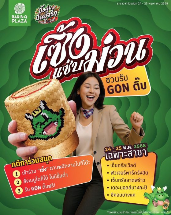 กรุงเทพฯ, 24 พฤษภาคม 2568 —เปิดศึกประชันความแซ่บวันแรก มาเซิ้งให้โลกจำ บาร์บีคิวพลาซ่า จัดกิจกรรมสุดม่วน “เซิ้งแซ่บม่วน ชวนรับ GON ติ๊บ” สายกิน สายมันส์ และสายแซ่บ มาปล่อยของประชันลีลา “เซิ้ง” สไตล์อีสานแบบไม่ต้องซ้อม ปลุกพลังความม่วนคักๆ ให้ลุกเป็นไฟทั้ง 5 สาขา ได้แก่ สาขาเซ็นทรัลเวิลด์, สาขาฟิวเจอร์พาร์ครังสิต, สาขาเซ็นทรัลลาดพร้าว, สาขาเดอะมอลล์ไลฟ์สโตร์ บางกะปิ และ สาขาซีคอนบางแค