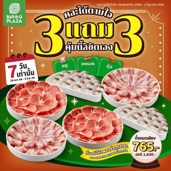 รอบก่อนใครพลาด รอบนี้ห้ามพลาดซ้ำ บาร์บีคิวพลาซ่า ปลุกกระแสความคุ้มกลับมาอีกครั้ง! กับ โปรโมชันสุดฮอต “3 แถม 3 คละได้ตามใจ คุ้มนี้ลิขิตเอง” พร้อมเสิร์ฟความอร่อยที่คุณเลือกได้เอง จนใครเห็นก็ต้องร้องว้าว! ได้แก่ ประหยัดหมู, ประหยัดเบคอน และ ประหยัดกุ้งสด คละได้ตามใจรวม 6 ถาด ในราคาเพียง 765 บาท (จากปกติ 1,530 บาท) ลดแรงครึ่งราคา! ไม่มีการจำกัดสิทธิ์ต่อใบเสร็จ! (ราคานี้รวมภาษีมูลค่าเพิ่มเรียบร้อยแล้ว)