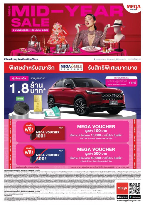 เมกาบางนา เสิร์ฟดีลร้อนๆ พร้อมช้อปทันที! กับแคมเปญ “MEGA MID-YEAR SALE” ลุ้นรางวัลรวมมูลค่ากว่า 1.8 ล้านบาท วันที่ 1 มิ.ย. – 31 ก.ค. 68 ณ ศูนย์การค้าเมกาบางนา