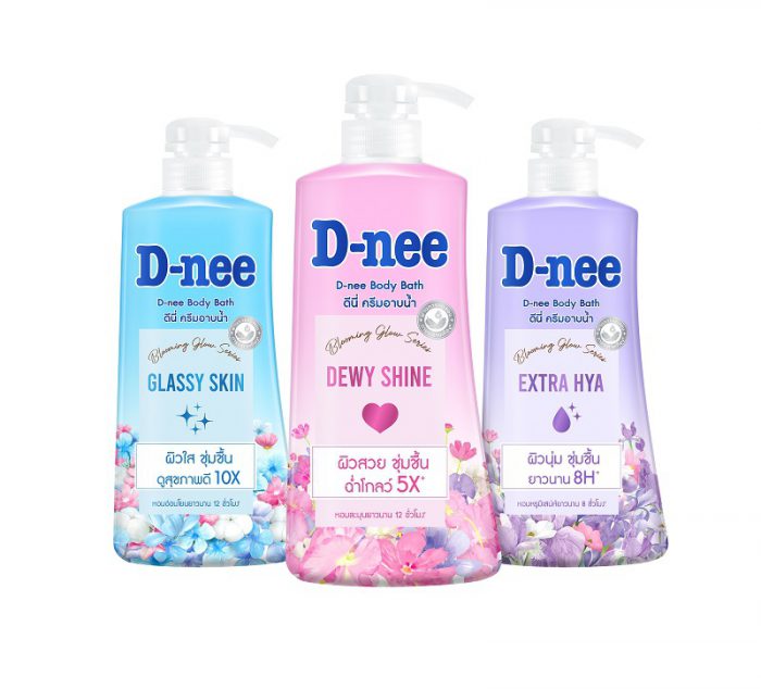 ดีนี่ ครีมอาบน้ำ บลูมมิ่งโกลว์ ซีรีส์ (D-nee Body Bath Blooming Glow Series) ครีมอาบน้ำที่ทำความสะอาดอย่างล้ำลึกและอ่อนโยนด้วยสารทำความสะอาดจากธรรมชาติ 100% ผสานเทคโนโลยี Duo Skin Essence และ Scent Booster ให้กลิ่นหอมติดผิวยาวนานถึง 12 ชั่วโมง มีให้เลือก 3 สูตรเพื่อตอบโจทย์สภาพผิวที่แตกต่างกัน