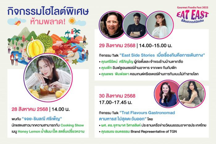 ต่อด้วยกิจกรรม Talk “East Side Stories เมื่อเรื่องกินคือการเดินทาง” ถ่ายทอดแรงบันดาลใจจากกูรูอาหารและคอนเทนต์ครีเอเตอร์ชื่อดัง ได้แก่ คุณศรีรัตน์ ศรีภิญโญ (บ้านตาเกลือ) คุณพีท จากเพจ กินกับพีท คุณแพร-พิมพ์ลดา ไชยปรีชาวิทย์ ครีเอเตอร์ด้านการกินอย่างยั่งยืน วันที่ 29 สิงหาคม 2568 เวลา 14.00-15.00 น.