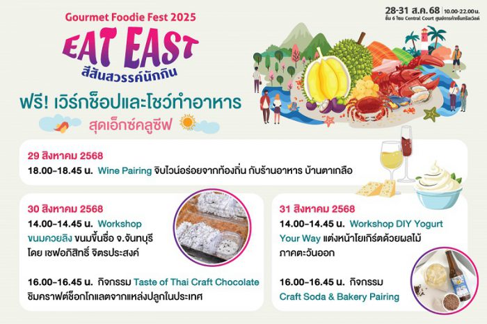 เตรียมอิ่มอร่อยและเปิดประสบการณ์อาหารภาคตะวันออกในงาน “Gourmet Foodie Fest 2025 : Eat East-สีสันสวรรค์นักกิน” ในวันที่ 28-31 สิงหาคม 2568 เวลา 10.00-22.00 น. ณ โซน Central Court ชั้น 6 ศูนย์การค้าเซ็นทรัลเวิลด์