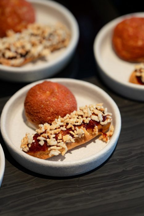 นอกจากนี้ วัตถุดิบในท้องถิ่นยังมีบทบาทสำคัญในการทำขนมของเชฟชู โดยผลไม้อย่าง ลิ้นจี่ค่อม จากสมุทรสงครามที่หอมหวานละมุน หรือข้าวโพดย่างแบบไทย ๆ ที่เชฟชูมักจะนำมาต่อยอดกับการสร้างสรรค์เมนูขนมฝรั่งเศสได้อย่างกลมกลืนและมีเอกลักษณ์