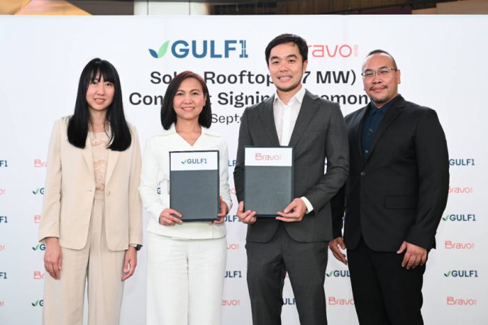 พิธีลงนามจัดขึ้นในวันที่ 9 กันยายน 2568 ณ ลานกิจกรรม Atrium ชั้น 1 ศูนย์การค้า Bravo BKK โดยมี คุณโกห์ ซู ซิง ประธานเจ้าหน้าที่บริหาร บริษัท บราโว บีเคเค จำกัด, คุณเลวี่ ลี ประธานเจ้าหน้าที่ดูแลประสบการณ์ลูกค้า บริษัท บราโว บีเคเค จำกัด, คุณอำนวยพร ประกอบนพเก้า กรรมการผู้จัดการ บริษัท กัลฟ์1 จำกัด และ คุณนิธิพร โปษณเจริญ ผู้ช่วยผู้อำนวยการฝ่ายการขาย บริษัท กัลฟ์1 จำกัด ร่วมลงนามในสัญญาโครงการ “Gulf1 x Bravo BKK Solar Rooftop” เดินหน้าติดตั้งระบบผลิตไฟฟ้าจากพลังงานแสงอาทิตย์บนหลังคาของศูนย์การค้า Bravo BKK เพื่อขับเคลื่อนนโยบายด้านความยั่งยืนของทั้งสององค์กรในการใช้พลังงานสะอาด ย้ำจุดยืนในการเป็นศูนย์การค้าที่ผสานนวัตกรรมเข้ากับความรับผิดชอบต่อสิ่งแวดล้อม
