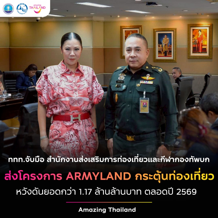 ททท. จับมือ สนง.ส่งเสริมการท่องเที่ยวและกีฬา ทบ. เปิดมิติใหม่แห่งการท่องเที่ยวในพื้นที่ทหาร ARMYLAND ผจญภัย เดินป่า แคมป์ปิ้ง ดูดาว ตั้งเป้าปี 2569 กว่า 1.17 ล้านล้านบาท