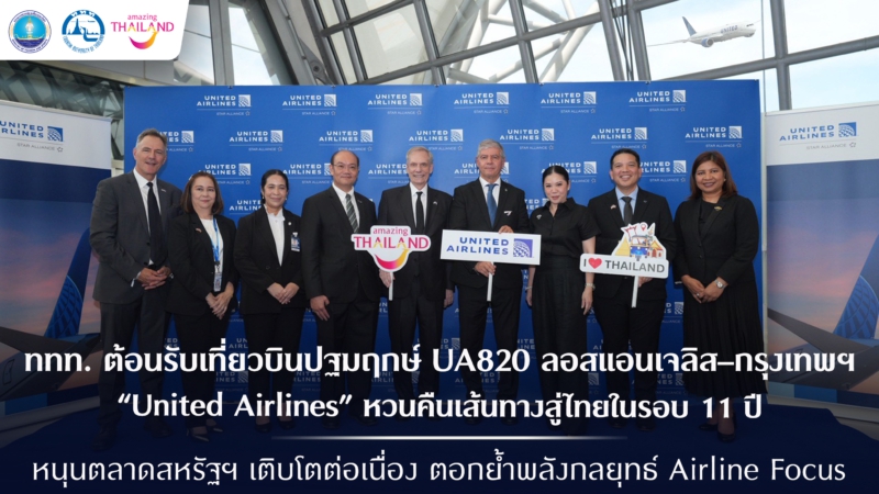 26 ตุลาคม 2568 – การท่องเที่ยวแห่งประเทศไทย (ททท.) ร่วมต้อนรับเที่ยวบินปฐมฤกษ์ UA820 เส้นทางลอสแอนเจลิส–กรุงเทพฯ (แวะพักที่ฮ่องกง) ของสายการบิน United Airlines ณ ท่าอากาศยานสุวรรณภูมิ นับเป็นการกลับมาทำการบินของสายการบินสัญชาติสหรัฐอเมริการายแรกในรอบกว่า 11 ปี สร้างหมุดหมายเชิงกลยุทธ์ภายใต้แผน Airline Focus ของ ททท. ในการขยายและกระจายนักท่องเที่ยวคุณภาพจากตลาดระยะไกลสู่ประเทศไทย โดยพิธีต้อนรับได้รับเกียรติจากนางสาวฐาปนีย์ เกียรติไพบูลย์ ผู้ว่าการ ททท. นายโรเบิร์ต เอฟ. โกเดค เอกอัครราชทูตสหรัฐอเมริกาประจำประเทศไทย ผู้บริหารสายการบิน United Airlines และหน่วยงานพันธมิตรด้านการบินร่วมให้การต้อนรับอย่างอบอุ่น