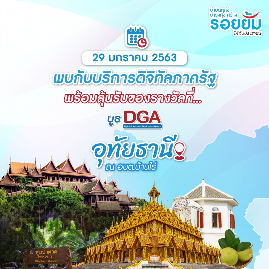 สำนักงานพัฒนารัฐบาลดิจิทัล (องค์การมหาชน) (สพร.) ขอเชิญผู้สนใจเข้าร่วมงาน “บำบัดทุกข์ บำรุงสุข สร้างรอยยิ้มให้ประชาชน” ณ. หน้าที่ทำการ อบต.บ้านไร่ จังหวัดอุทัยธานี ในวันที่ 29 มกราคม 2563 โดย สพร. ได้นำบริการดิจิทัลภาครัฐที่เป็นประโยชน์ต่อประชาชน มาให้พี่-น้องชาวอุทัยธานี อาทิ ตู้บริการอเนกประสงค์ภาครัฐ หรือ Government Smart Kiosk ช่องทางเพื่อการเข้าถึงข้อมูลและบริการภาครัฐ แบบครบวงจร ในรูปแบบดิจิทัลด้วยบัตรประจำตัวประชาชนเพียงใบเดียว พร้อมแนะนำ Application CITIZENinfo ที่ถูกพัฒนาขึ้นเพื่อให้ประชาชนสามารถเข้าถึงจุดให้บริการ และจัดเตรียมเอกสารล่วงหน้าในการเข้าใช้บริการ ตลอดจนช่วยอำนวยความสะดวกในการเดินทาง นอกจากนั้นเพื่อภาคธุรกิจ สพร.ได้เตรียมบริการ Biz Portal ภายใต้เว็บไซต์ biz.govchannel.go.thbiz.govchannel.go.th ซึ่งเป็นศูนย์กลางข้อมูลให้ภาคธุรกิจติดต่อราชการแบบเบ็ดเสร็จ ครบวงจร ณ จุดเดียว บริการฉับไว เว็บเดียวจบ ครบทุกเรื่องและพบกับกิจกรรมสนุกๆ ร่วมเล่นเกมส์รับของที่ระลึกมากมาย ที่บูธ สพร. ณ.งาน “บำบัดทุกข์ บำรุงสุข สร้างรอยยิ้มให้ประชาชน”