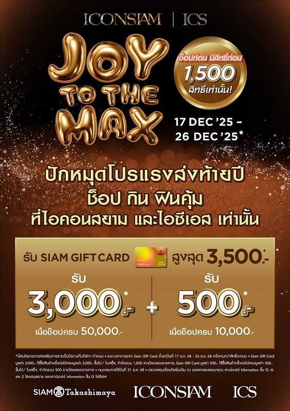 ไอคอนสยาม และไอซีเอส ไลฟ์สไตล์ คอมเพล็กซ์ กระตุ้นการจับจ่ายในช่วงเทศกาลส่งท้ายปี ด้วยการมอบของขวัญสุดพิเศษผ่านโปรโมชั่นแคมเปญ “JOY TO THE MAX” ให้ลูกค้าเอนจอยกับความสุขขั้นสุด รับ Siam Gift Card ทุกวัน สูงสุด 3,500 บาทต่อท่าน รวมมูลค่ากว่า 3 ล้านบาท