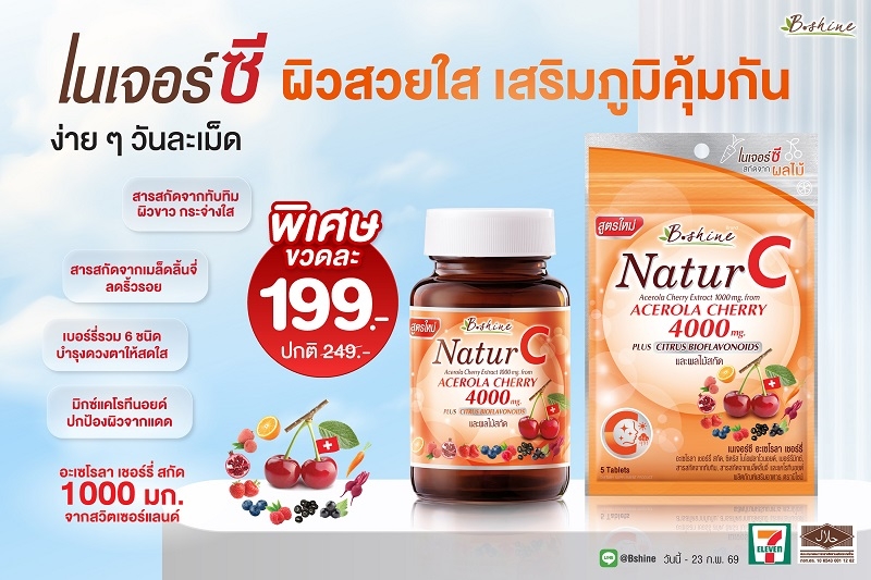 บีไชน์ เนเจอร์ซี สูตรใหม่ แบบขวด 30 เม็ด (แถมฟรี 5 เม็ด) จัดโปรโมชั่นพิเศษ ราคาเพียง 199 บาท จากราคาปกติ 249 บาท และสมาชิก All Member รับ 1 เหรียญ ตั้งแต่วันนี้ – 23 กุมภาพันธ์ 2569 ที่ร้านเซเว่น อีเลฟเว่น ทุกสาขาทั่วประเทศ