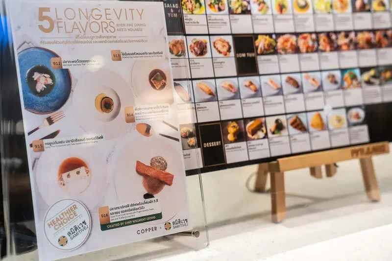 นอกจากการออกแบบเมนูใหม่แล้ว ยังได้คัดเลือกเมนูยอดนิยมของ Copper มาจัดเป็นเมนูทางเลือกสุขภาพ ภายใต้ตราสัญลักษณ์ “Healthier Choice Recommended by Samitivej” ที่ผ่านการรับรองจากนักโภชนาการ ทั้งหมด 6 เมนู คือ เซียร์นอร์วีเจียนเทราต์โฟมยูซุ, ไข่ตุ๋นกุ้งคริลล์, ปลากะพงเว็ตเอจ และกุ้งอาร์เจนตินา ครีมเห็ดพอร์ชินี, ปลากะพงเว็ตเอจ องุ่น และเอสเซ้นส์มะเขือเทศ, สลัดฟักทองมากุโระ, ซุปเย็นกัซปาโชสับปะรด (สูตรลดน้ำตาล) เพื่อให้ผู้รับบริการมั่นใจได้ว่าอร่อยและดีต่อสุขภาพ