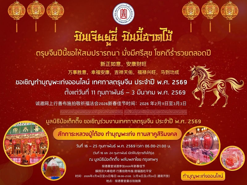 ระหว่างวันที่ 16 – 25 กุมภาพันธ์ พ.ศ. 2569 มูลนิธิป่อเต็กตึ๊ง โดย นายวิเชียร เตชะไพบูลย์ ประธานกรรมการ ขอเชิญศิษยานุศิษย์ และสาธุชนทุกท่าน ร่วม “สักการะหลวงปู่ไต้ฮง” ขอพรเนื่องในเทศกาลตรุษจีน ลงชื่อ สวดชัยมงคลคาถา หรือ “พะเก่ง” เพื่อความเป็นสิริมงคลตลอดปี เป็นพิธีมหามงคลใหญ่ 1 ปีมีเพียงครั้งเดียว ที่เปิดให้ทุกท่านได้เลือกทำบุญพะเก่งๆ ละ 20 บาทตามแต่ประสงค์ ประกอบด้วย ขอให้ครอบครัวมีสุข (แกหมึ่งเก่ง) , สะเดาะเคราะห์ (ปออุ่งเก่ง) , เสริมโชคลาภ (คิ่วไฉ่เก่ง) , เสริมดวงชะตา (ส่วยกุงเก่ง) , เสริมความมั่นคงสถาพร (กึงกีเก่ง) รวมถึงทำบุญสะเดาะเคราะห์และเสริมความเป็นสิริมงคลกับรูปปั้นนักษัตรปีมะเมีย รับประทาน “สาคูสิริมงคล” เพื่อความกลมเกลียวและอยู่เย็นเป็นสุข อัญเชิญ “ฮู้แดง” (ยันต์) ของหลวงปู่ไต้ฮง เพื่อนำไปประทับหน้าบ้าน เคหะสถาน หรือพกติดตัวเพื่อคุ้มครอง “เคาะระฆังทอง” ให้ก้องกังวานเพื่อให้ชีวิตสดใส การงานรุ่งเรืองระบือไกล และ ร่วม “พิธีเวียนธูปศักดิ์สิทธิ์” เพื่อขอพรเทพยดาฟ้าดินเนื่องในวันประสูติ (ทีกงแซ) ซึ่งในปีนี้ตรงกับวันอังคารที่ 24 กุมภาพันธ์ 2569 ขออำนาจฟ้าดินเป็นที่พึ่ง ขอให้สิ่งศักดิ์สิทธิ์ที่ตนนับถือ เช่น หลวงปู่ไต้ฮง ช่วยดลบันดาลให้ประสบโชคดีตลอดปีใหม่ (โดยในวันที่ 16 และ 24 กุมภาพันธ์ 2569 มูลนิธิป่อเต็กตึ๊ง เปิดบริการโต้รุ่ง)
