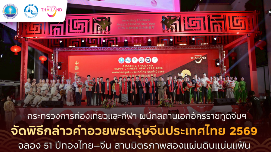 วันที่ 14 กุมภาพันธ์ 2569 ณ ลานพาร์คพารากอน ศูนย์การค้าสยามพารากอน กระทรวงการท่องเที่ยวและกีฬา โดยการท่องเที่ยวแห่งประเทศไทย (ททท.) ร่วมกับสถานเอกอัครราชทูตสาธารณรัฐประชาชนจีนประจำประเทศไทย จัดพิธีกล่าวคำอวยพรเทศกาลตรุษจีนประเทศไทย ประจำปี 2569 เนื่องในโอกาสครบรอบ 51 ปี ความสัมพันธ์ทางการทูตไทย–จีน และครบรอบ 22 ปี ความร่วมมือด้านวัฒนธรรมการท่องเที่ยว โดยได้รับเกียรติจาก นายอรรถกร ศิริลัทธยากร รัฐมนตรีว่าการกระทรวงการท่องเที่ยวและกีฬา นายจาง เจี้ยนเว่ย เอกอัครราชทูตสาธารณรัฐประชาชนจีนประจำประเทศไทย กล่าวอวยพรเนื่องในเทศกาลตรุษจีนประเทศไทย เฉลิมฉลองครบรอบ 51 ปี ความสัมพันธ์ทางการทูตระหว่างไทย-จีน พร้อมด้วยนางสาวฐาปนีย์ เกียรติไพบูลย์ ผู้ว่าการการท่องเที่ยวแห่งประเทศไทย (ททท.) นายหยาง เสี่ยวหลง ที่ปรึกษาฝ่ายวัฒนธรรมสถานเอกอัครราชทูตจีน พลตำรวจโท ศักย์ศิรา เผือกอ่ำ ผู้บัญชาการตำรวจท่องเที่ยว และนางชฎาทิพ จูตระกูล ประธานเจ้าหน้าที่บริหารกลุ่ม บริษัท สยามพิวรรธน์ จำกัด พร้อมด้วยผู้บริหาร และหน่วยงานพันธมิตรภาครัฐและเอกชน เข้าร่วมพิธีดังกล่าวฯ