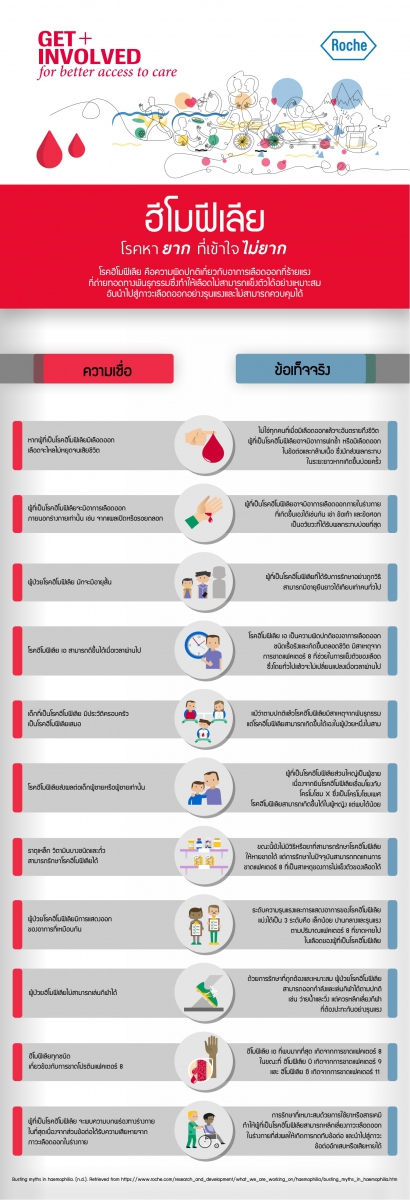ฮีโมฟีเลีย เป็นโรคที่ไม่ควรมองข้าม ทั้งยังต้องมีความเข้าใจที่ถูกต้องต่อการปฏิบัติตัวของผู้ป่วย และการได้รับกำลังใจจากผู้คนรอบข้าง เพื่อให้มีคุณภาพชีวิตที่สมบูรณ์และเป็นปกติสุขมากที่สุดทั้งในด้านร่างกายและจิตใจ ติดตามข่าวสารเพิ่มเติมเกี่ยวกับกิจกรรมออนไลน์ของชมรมผู้ป่วยโรคเลือดออกง่ายฮีโมฟีเลียแห่งประเทศไทยได้ที่เฟซบุ๊ก @Thaihemophiliaclub หรือเว็บไซด์ https://www.roche.co.th/th/disease-areas/busting-myths-in-haemophilia.html