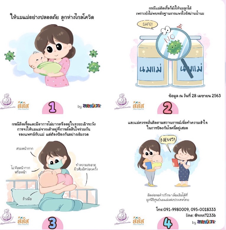 จากข้อมูล ณ วันที่ 28 เมษายน 2563 จากองค์การอนามัยโลก และงานวิจัยจากทั้งประเทศจีนและอีกหลายประเทศ ยังไม่พบว่ามีเชื้อโควิด-19 ในน้ำนมแม่ แม่ที่ติดเชื้อหรือมีความเสี่ยงต่อการติดเชื้อ จึงสามารถให้นมได้ โดยเน้นเรื่องการป้องกันการแพร่เชื้อด้วยการสวมหน้ากากอนามัย ล้างมือให้สะอาด และ เว้นระยะห่าง