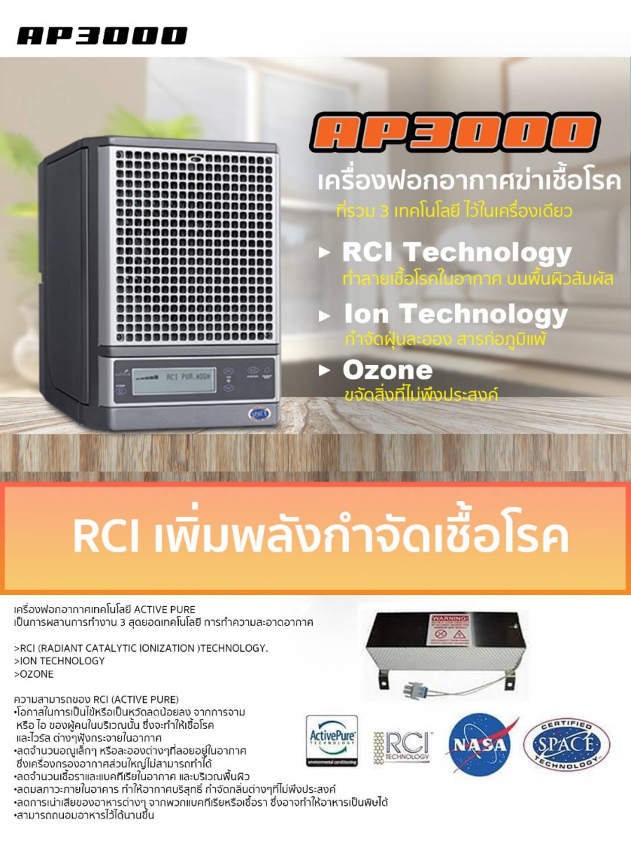 สำหรับ เทคโนโลยี Active Pure ของเครื่องฟอกอากาศฆ่าเชื้อ AP3000 จะประกอบด้วยเทคโนโลยี RCI สามารถผลิตไฮโดรเจน เปอร์ออกไซด์ จาก(รังผึ้ง) ลิขสิทธิ์เฉพาะ ซึ่งทำหน้าที่กำจัดเชื้อโรคทุกชนิด และเชื้อไวรัสต่างๆ โดยเฉพาะเชื้อไวรัส COVID-19 ที่สามารถแพร่กระจายจากการสัมผัสบนพื้นผิวต่างๆ เช่น พื้น ลูกบิดประตู ราวบันได หรือเชื้อโรคที่กระจายอยู่ในอากาศ ได้อย่างดี