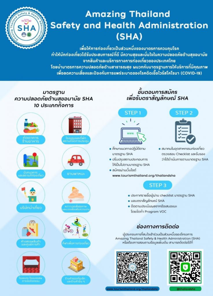 นายยุทธศักดิ์ สุภสร ผู้ว่าการการท่องเที่ยวแห่งประเทศไทย(ททท.) กล่าวว่าโครงการ Amazing Thailand Safety & Health Administration (SHA) จะเปิดโอกาสให้สถานประกอบการที่เกี่ยวข้องกับอุตสาหกรรมท่องเที่ยวไทย ต้องการสร้างความมั่นใจให้กับผู้ใช้บริการ สามารถสมัครเข้าร่วมเพื่อรับตราสัญลักษณ์ ผ่านเว็บไซต์ www.tourismthailand.org/thailandsha โครงการฯ จะมีการแบ่งประเภทผู้ประกอบการเป็น 10 ประเภท ประกอบด้วย ภัตตาคารร้านอาหาร, โรงแรมและที่พักสถานที่จัดการประชุม, นันทนาการและสถานที่ท่องเที่ยว, ยานพาหนะ, บริษัทนำเที่ยว, สุขภาพและความงาม , ห้างสรรพสินค้าและศูนย์การค้า, กีฬาเพื่อการท่องเที่ยว, โรงละคร โรงมหรสพการจัดกิจกรรม, ร้านค้าของที่ระลึกและร้านอื่นๆ