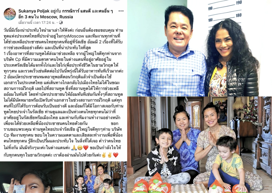 อ้อมก็ได้มีโอกาสเจอกับท่านทูตไทยประจำในรัสเซีย ท่านดูแลและเป็นห่วงคนไทยทุกคนไม่ว่าที่อาศัยอยู่ในรัสเซียหรือเมืองไทย และท่านกับทีมงานทำงานอย่างหนักเพื่อจะได้ช่วยเหลือพี่น้องประชาชนคนไทยด้วยกัน ขอกราบขอบพระคุณ ท่านทูตไทยประจำรัสเซีย ผู้ใหญ่ใจดีทุกๆท่าน บริษัท Cp ทีมงานทุกคน ขอบใจในความเมตตาและเสียสละทำงานเพื่อพี่น้องคนไทยทุกคน รู้สึกเป็นปรื้มและประทับใจ ในสิ่งที่ได้เจอ คำว่าคนไทยไม่ทิ้งกัน มันมีจริงๆนะค่ะในต่างแดนค่ะ 🙏😁❤ ขอเป็นกำลังใจให้กับทุกคน ในยามวิกฤตค่ะ เราต้องผ่านมันไปด้วยกันค่ะ✌✌❤”