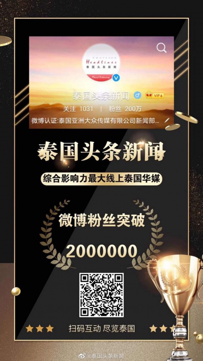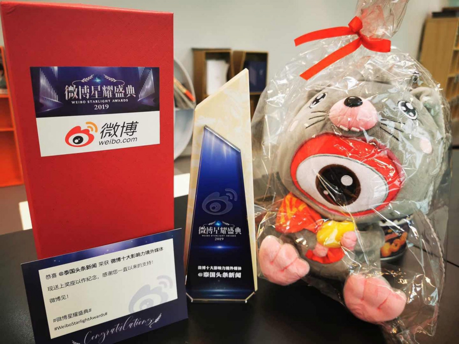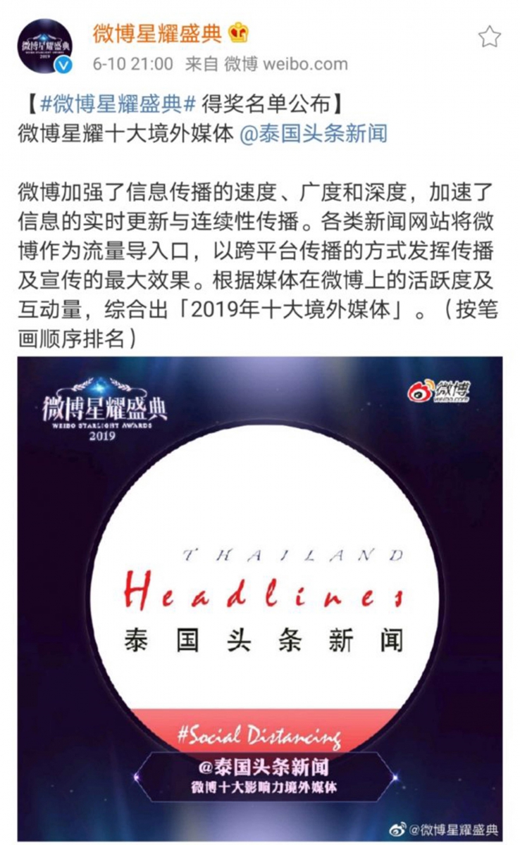 สำนักข่าว 泰国头条新闻 Thailand Headlines สื่อจีนอันดับ 1 ในไทย ได้รับรางวัล Weibo Starlight Awards 2019 และเป็นสื่อแรกและสื่อเดียวในประเทศไทยและเอเชียตะวันออกเฉียงใต้ที่ได้รับการจัดอันดับเป็น 1 ใน 10 สื่อจีนในต่างประเทศที่ทรงอิทธิพลใน Weibo